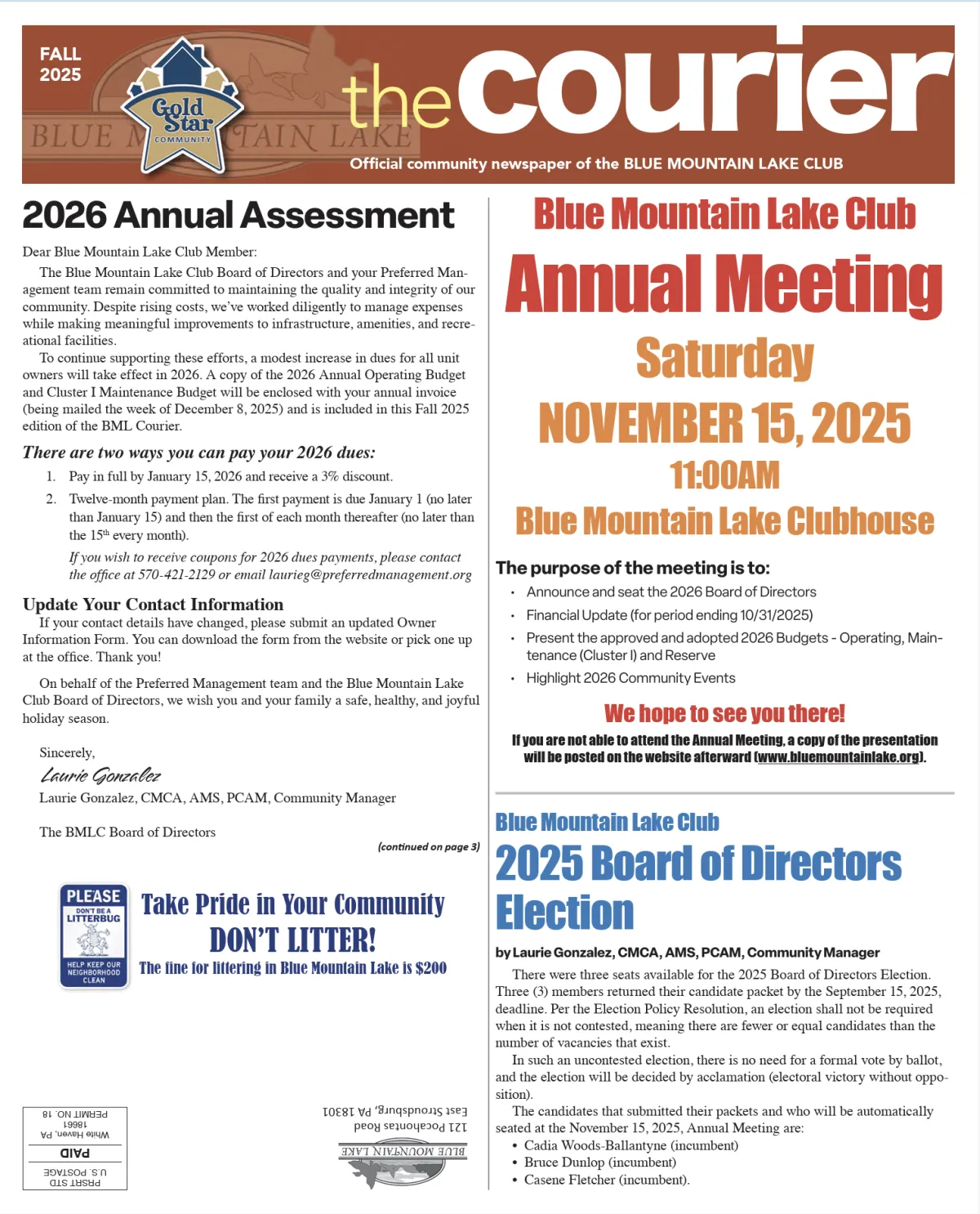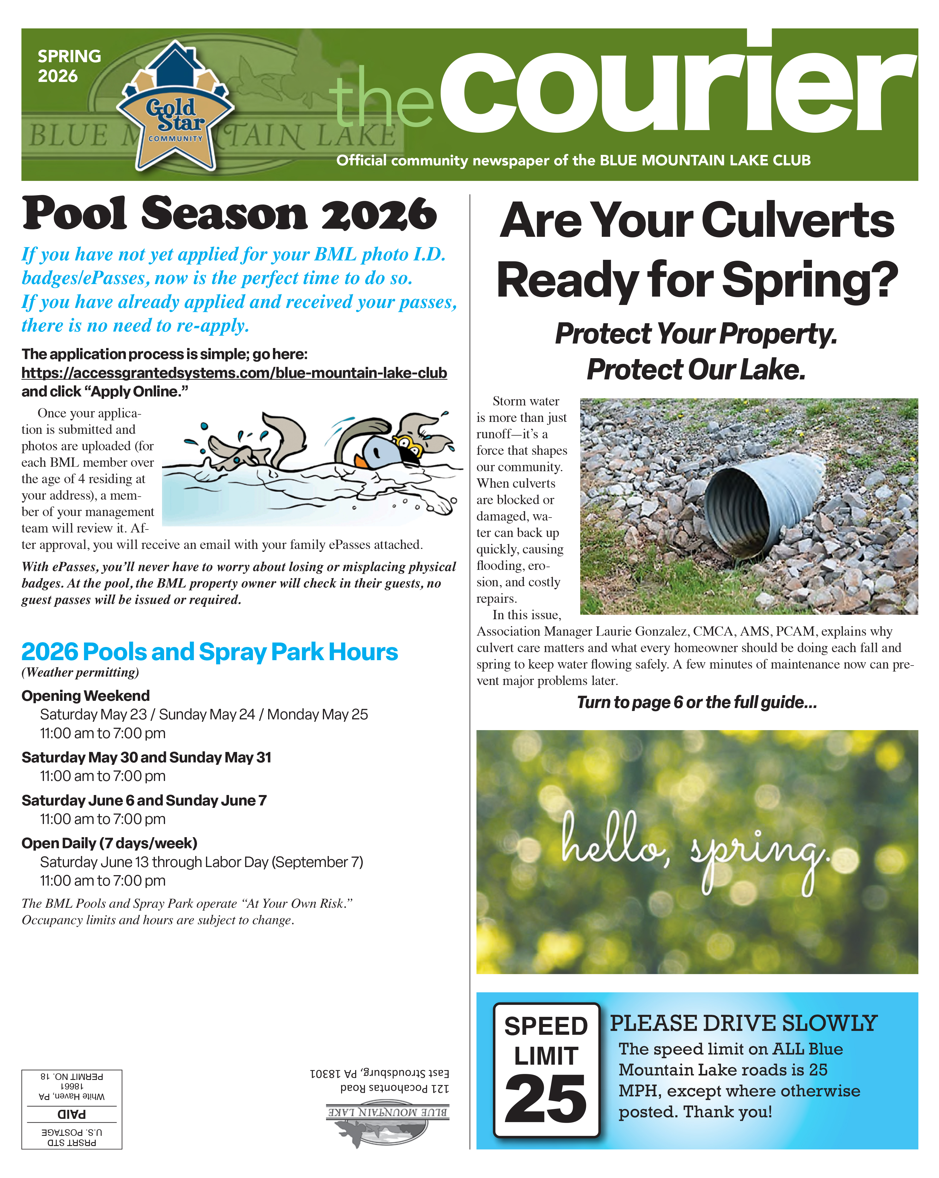 Blue Mountain Lake offers amenities that include 2 pools, a spray park (or splash pad), a lake, and recreational basketball and tennis/pickleball courts. The community center is the site of numerous social events throughout the year arranged by many active committees.